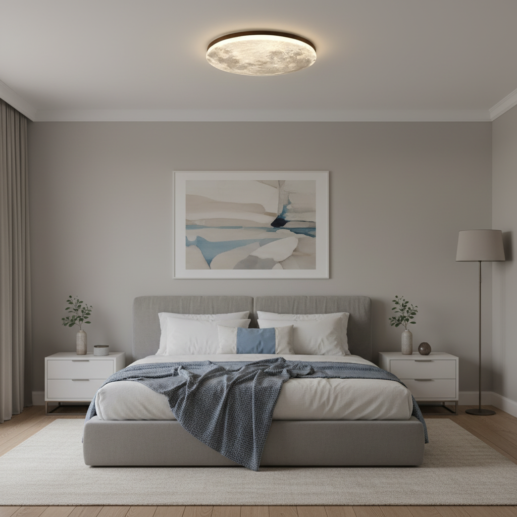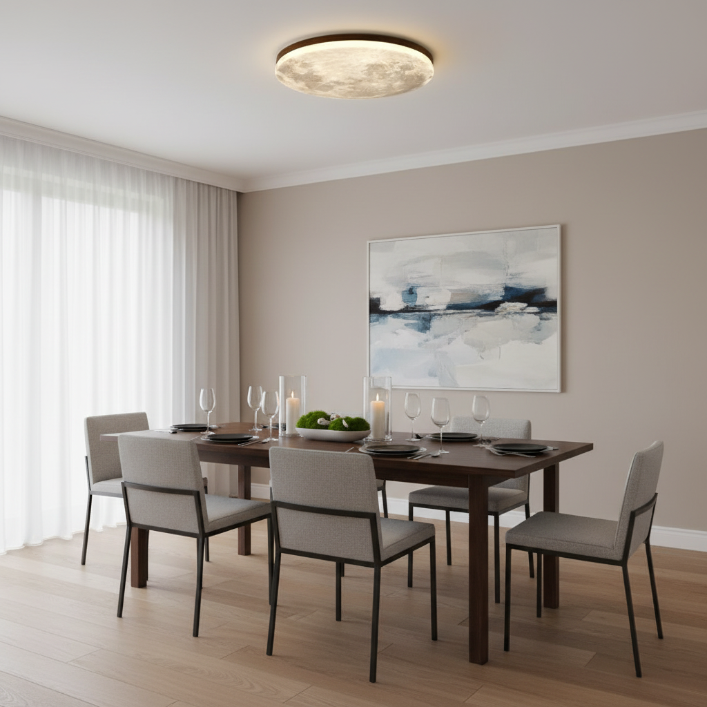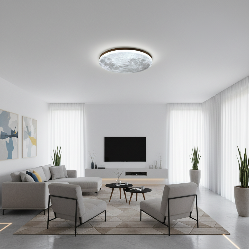 The Moon Ceiling Lamp is designed to bring a modern aesthetic to your living spaces. Its round disc shape, inspired by the elegance of the moon, provides a soft glow that enhances any room, whether it's a bedroom, living room, or dining area. This lamp not only provides gentle illumination but also acts as a striking focal point in your interior design.